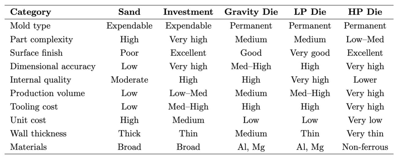 Casting processes are chosen based on complexity, surface finish, material, and required dimensional accuracy.