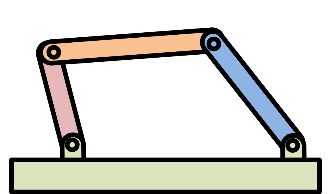 We often think of a four-bar linkage as being driven at the input angle \( \alpha, \), resulting in the output angle \( \beta. \) We only need one input, because the system has exactly \( N_{\rm DOF} = 1 \) degree of freedom. We can count the DOF as 9 free variables (three moving rigid bodies with three variables each) minus 8 constraints (four pin joints with two constraints each).