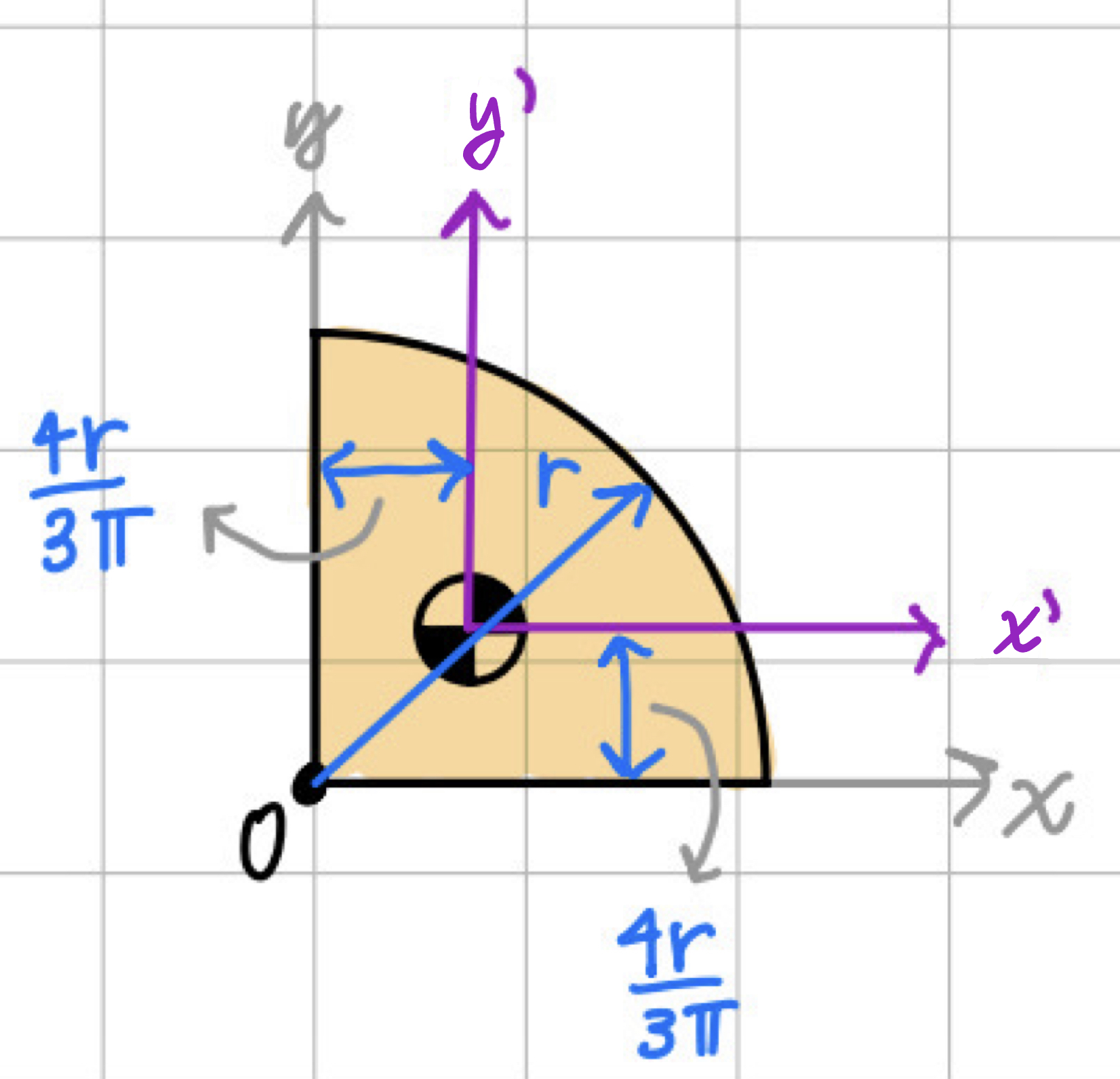 | Quarter circle | | \( I_{x'} = I_{y'} = \frac{1}{2}(\frac{\pi}{8} - \frac{8}{9\pi}) r^4 \) | \( I_x = I_y = \frac{1}{16} \pi r^4 \) \( J_O = \frac{1}{8} \pi r^4 \) |