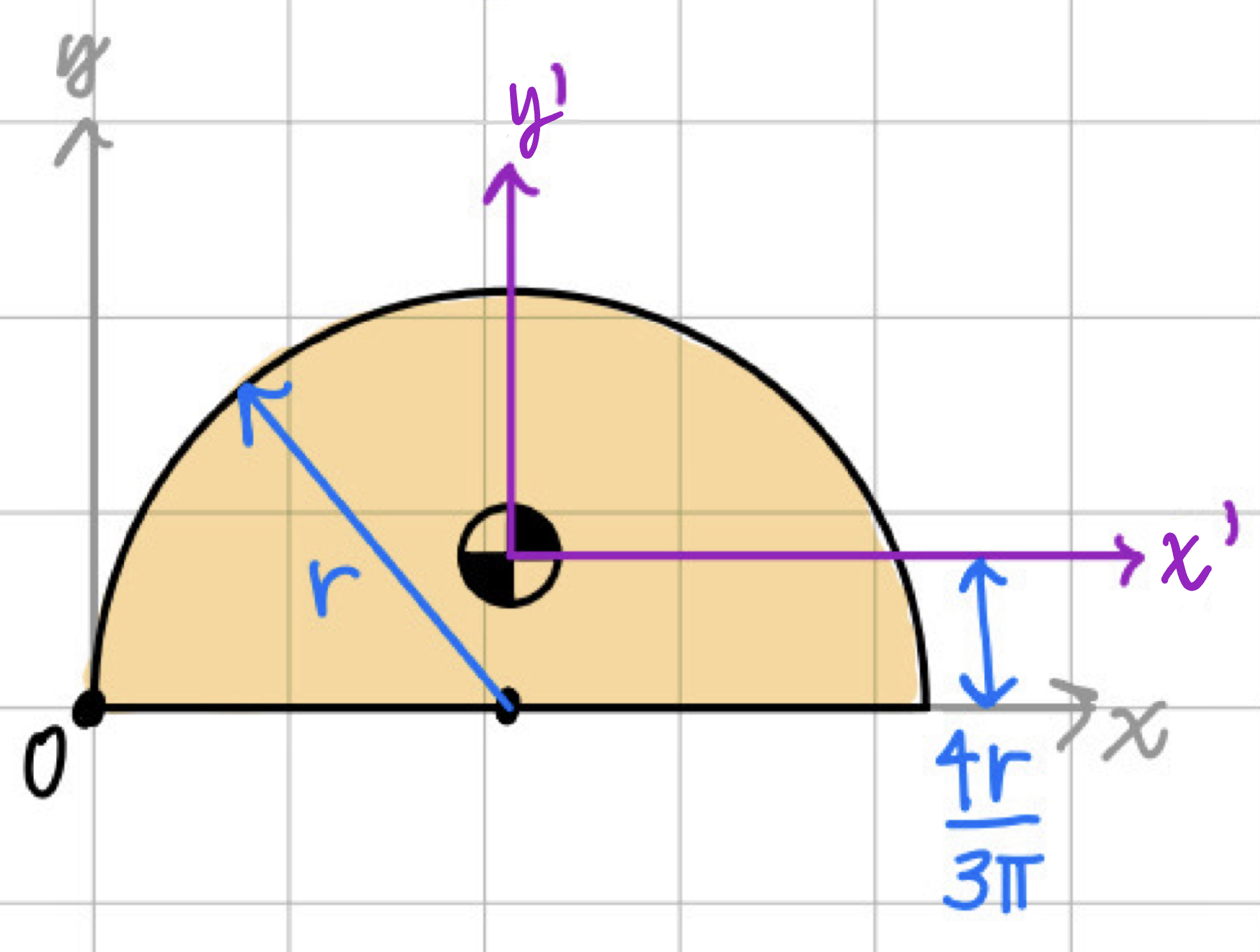 | Semicircle | | \( I_{x'} = (\frac{\pi}{8} - \frac{8}{9\pi}) r^4 \) \( I_{y'} = \frac{\pi}{8}r^4 \) | \( I_x = I_y = \frac{1}{8} \pi r^4 \) \( J_O = \frac{1}{4} \pi r^4 \) |