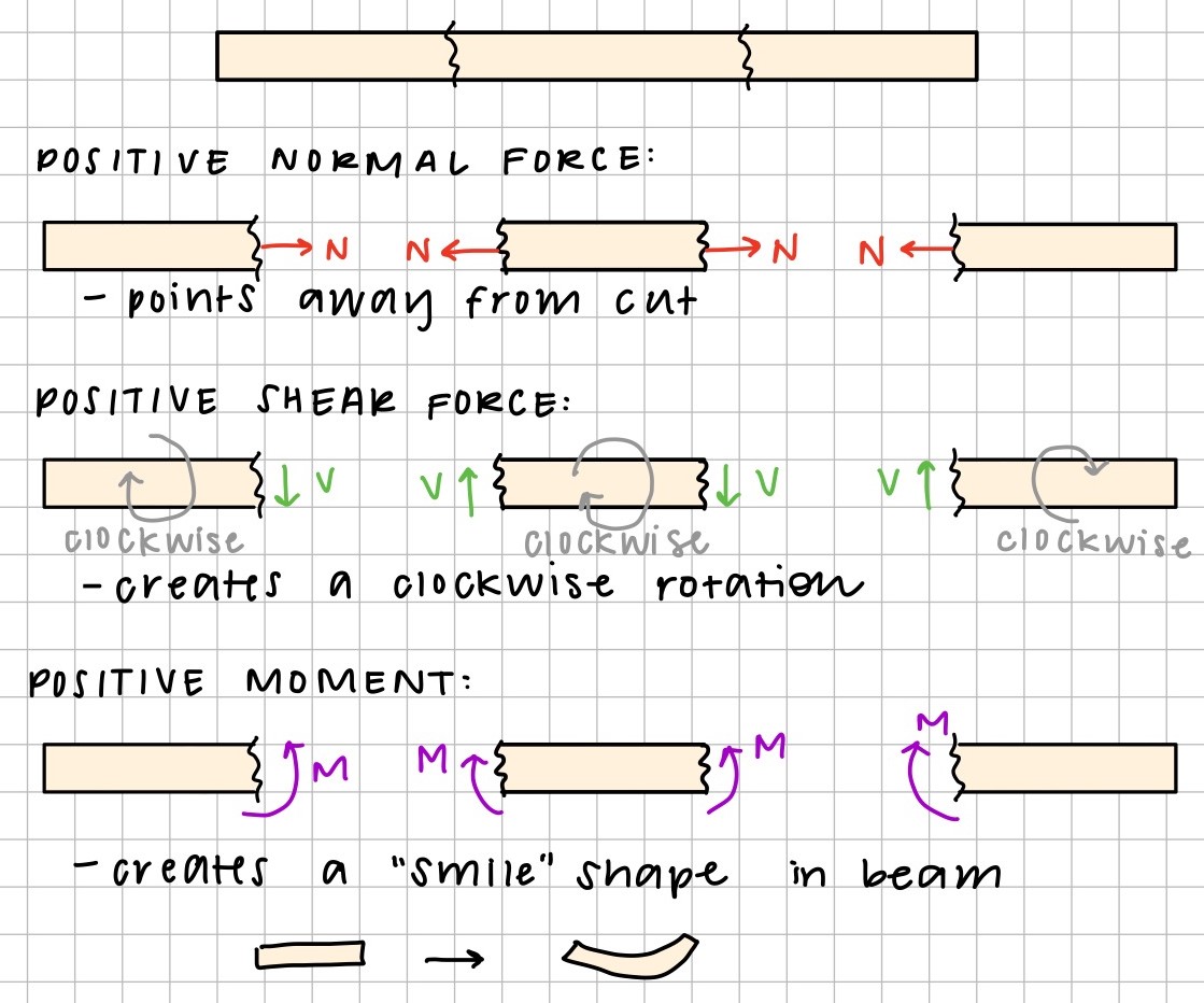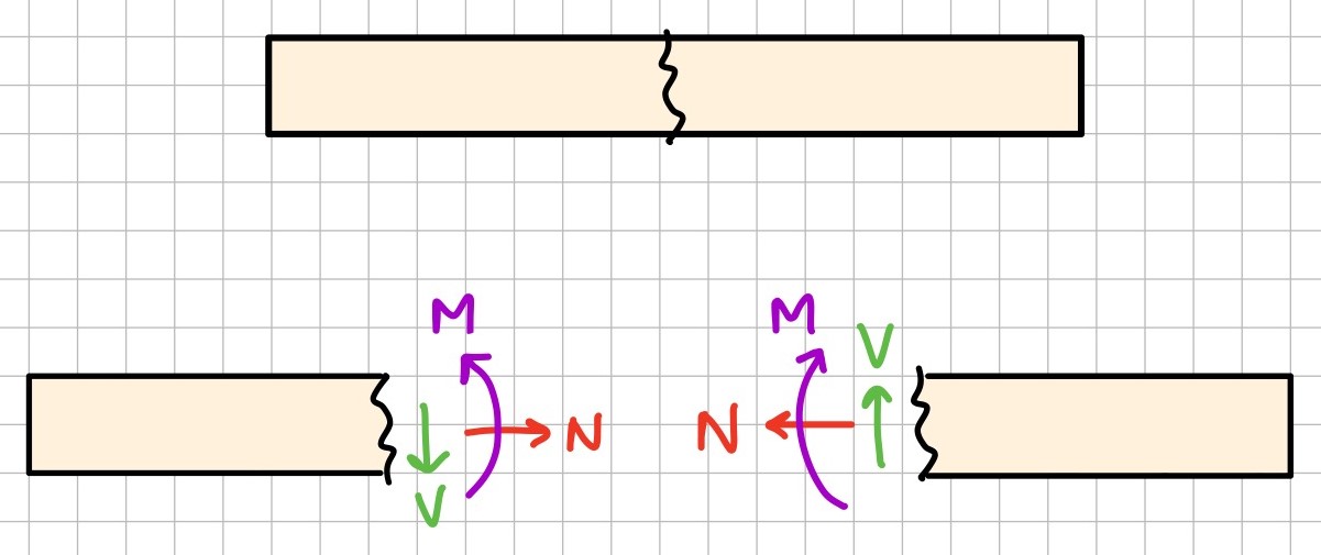 Internal forces of a member can be determined by creating an imaginary cut in a member, and then solving for the internal shear force, normal force, and bending moment (which, after the cut, become "external" forces that can be solved for).